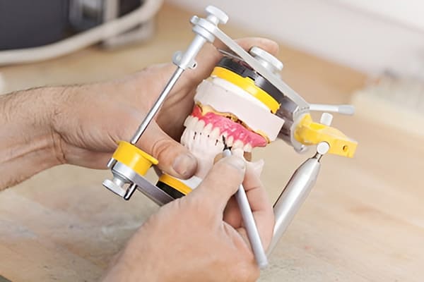 作製の最初の工程が、お口の中の型取りと模型作りです。次に、咀しゃく運動を再現できる咬合器に模型をセットし噛み合わせの位置を決めます。そして必要な情報がそろったら、歯科技工士と連携を取って入れ歯を作製します。